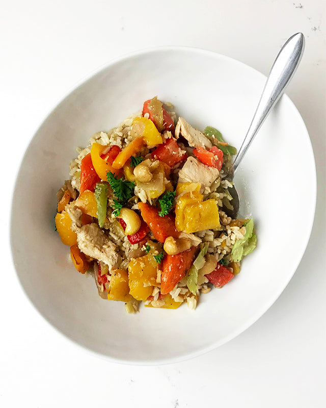 Chicken breast, red onions, bell peppers, carrot, celery, roasted cashews, tossed in a ginger garlic sweet and sour sauce set on top of seasoned brown rice