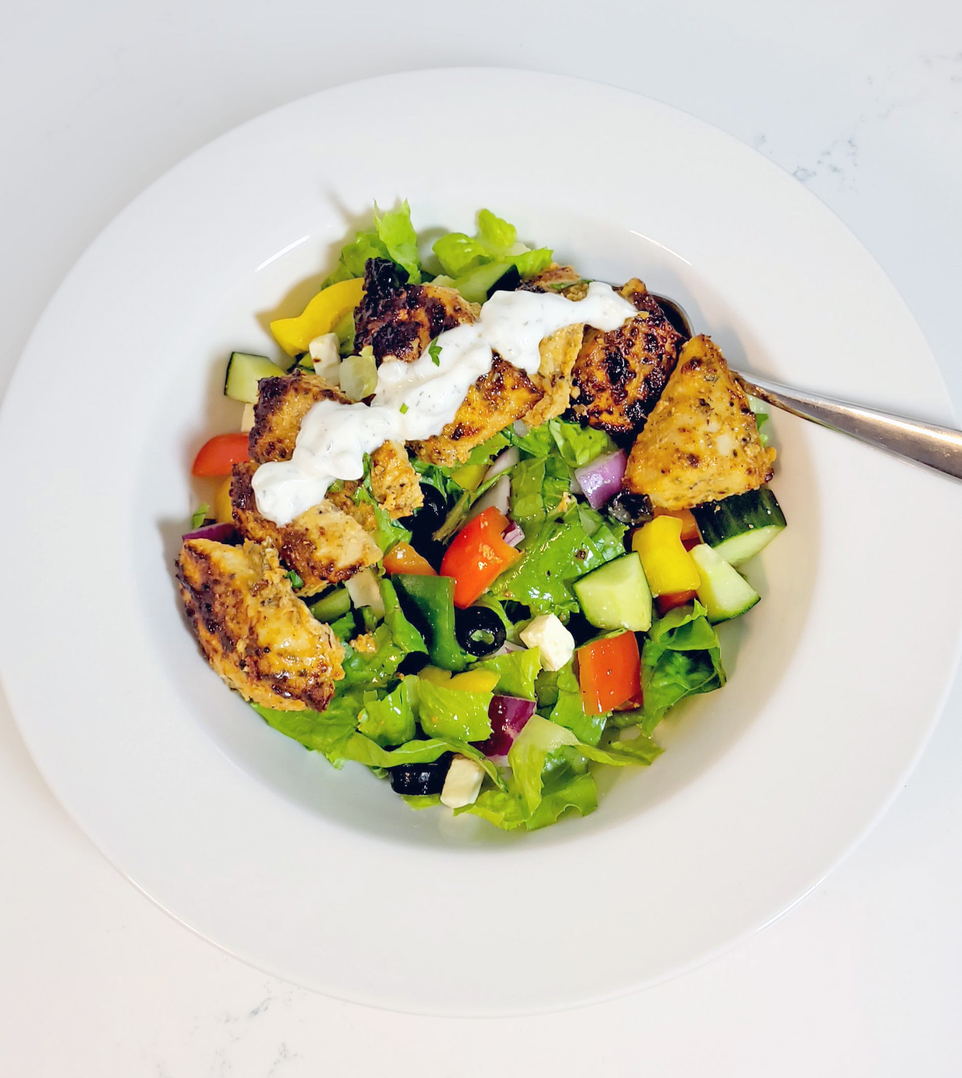 Greek Salad: cherry tomatoes, cucumber, red onion, feta cheese, black olives, EVOO, bell pepper, romaine lettuce, parsley.