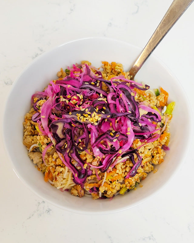 Ground pork (fresh garlic, tamari, rice vinegar, sesame oil, red pepper flakes, salt), onion, carrots, green cabbage, purple cabbage (lime juice, fresh ginger, sesame oil, organic cane sugar, salt), green onion, toasted sesame seeds, vermicelli rice noodles