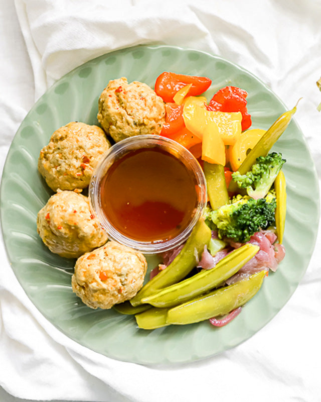 Pork balls (ground pork, onion powder, sea salt, paprika, sea salt, garlic powder, black pepper, sriracha sauce, sesame oil, tamari, oyster sauce, sweet chili), sweet bell peppers, broccoli, onion, fresh garlic, sea salt, onion powder, paprika, rice vinegar, pineapple, cane sugar, arrowroot powder, olive oil