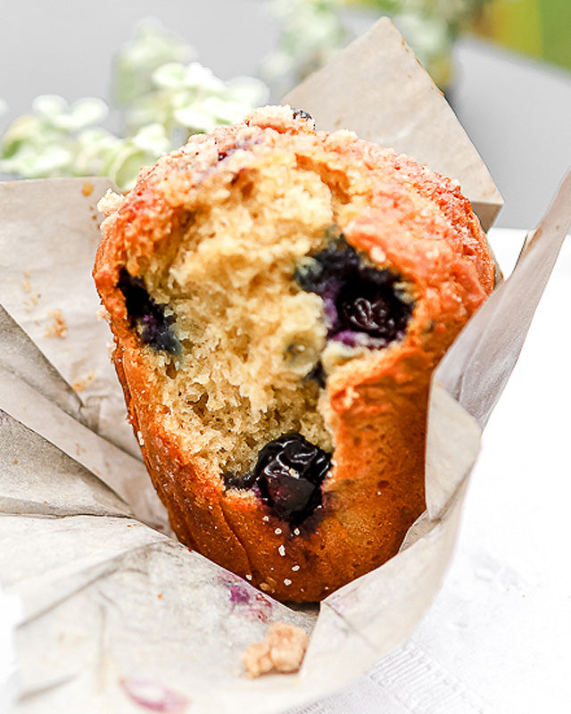 Perfectly fluffy and sweet muffin made extra moist with Greek yogurt and a bit zingy with fresh lemon, finished with a buttery cinnamon crumb topping. Get that extra go you need, now made with SFL Psyllium. Available with choices; blueberry, cranberry & walnut, strawberry & white chocolate chip, raspberry & chocolate chip.