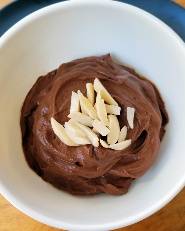 Unsweetened almond milk, avocado, vanilla extract, cocoa powder, dark chocolate chips, monkfruit, slivered almonds