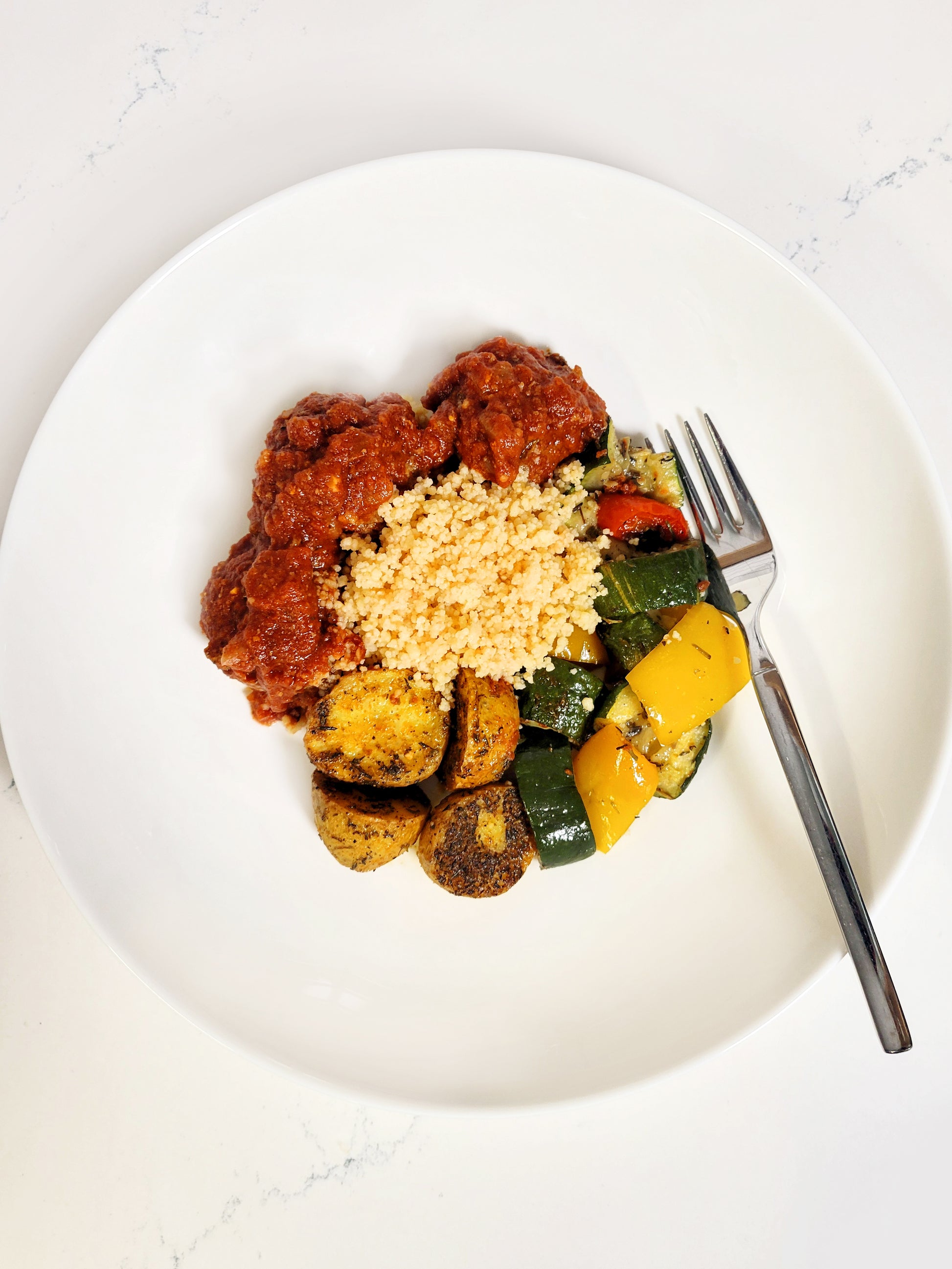 Features spiced ground beef kofta seasoned with paprika, cumin, garlic, and fresh herbs like parsley and cilantro. Cooked with tender vegetables such as tomatoes, zucchini, bell peppers, and potatoes, the dish is infused with rich flavors. A bay leaf and extra virgin olive oil add depth, and it's served alongside fluffy couscous for a comforting, aromatic meal.