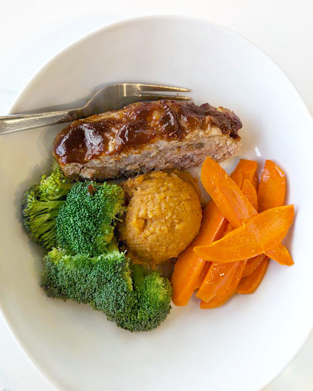 Can't go wrong with a classic. Seasoned pork meatloaf glazed with house made bbq sauce. On the side sweet potato mash, steamed broccoli and carrots