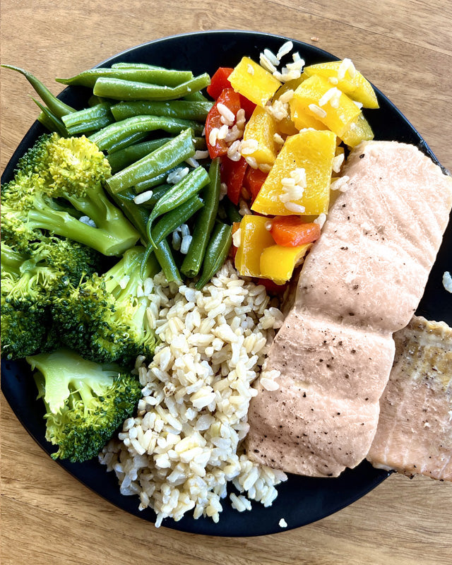 Roast salmon (6oz), blanched broccoli (1 cup), blanched green beans (1/2 cup), roasted bell peppers (1/2 cup), brown jasmine rice (3/4 cup), extra virgin olive oil, sea salt, black pepper