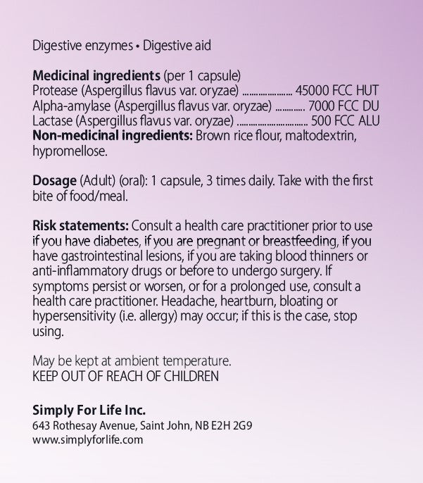 - Digestive enzyme/lactase to assist in the digestion of foods containing lactose (e.g. dairy foods, milk).